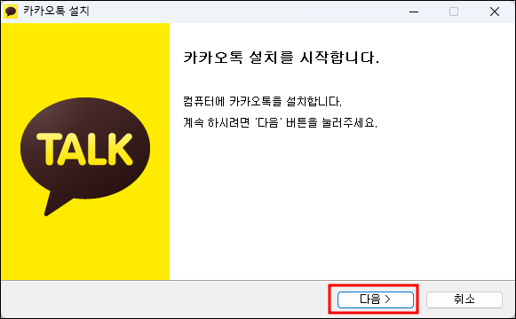 이제 카카오톡 설치가 진행됩니다. 아래의 카톡pc버전 설치 화면이 나오면 다음 버튼을 눌러 설치를 시작해 주세요.