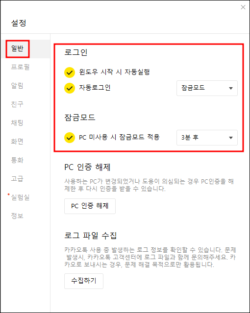설정 일반 메뉴에서 pc 미사용 시 카카오톡 pc버전 자동잠금을 세팅하실 수 있습니다. 자동로그인이 되면서 잠금화면으로 되게 해 주시고, 잠금 시간도 선택해 주세요.