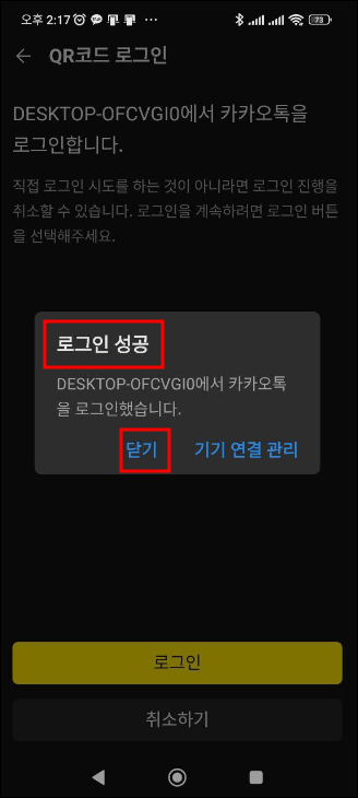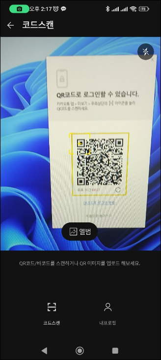 아래의 화면에서, 컴퓨터의 카카오톡 화면에서 QR코드 로그인을 눌러 주세요.
